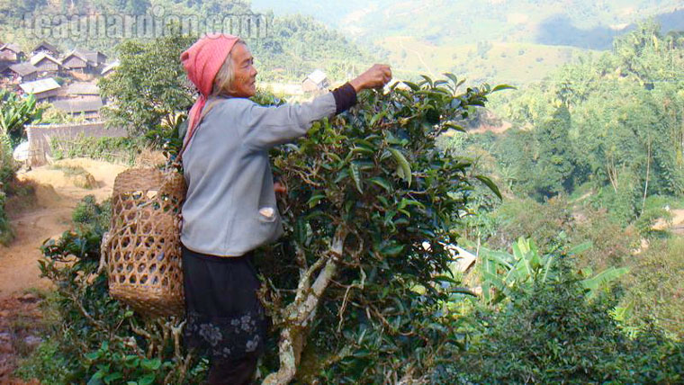 Old woman plucking off a tea tree just steps away from home. Such tea trees, not particularly huge and so I guess not particularly old, are scattered everywhere in the region. They are also the key production tea trees for most higher price puer shengcha, as well as that for the farmer’s own use. In old tea gardens, they are in small groups, dotted by some larger ones and flanked by some smaller ones. Typical waist level bushes in terraced gardens are still the major bases for the majority of the region’s total throughput, though.
