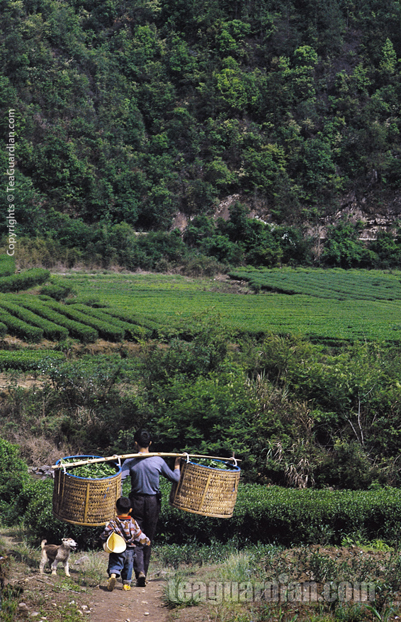 Man carrying two baskets of fresh tea leaves back to his home processing shack while the son following. Wuyishan, Fujian. Small stake tea farming is the back bone to the success of the tea economy in China.