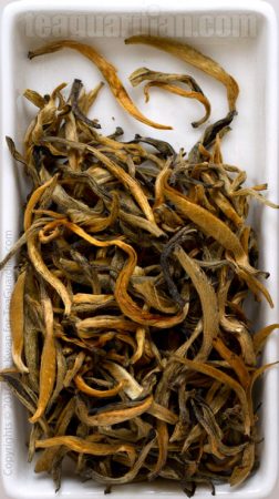 A tea that has been in the market for much longer and that gave me a very bad impression of Dianhong when I first studied the subcategory at the end of last century is Dianhong King ( left ), or King of Red Tea — Hongcha Wang. On first impression, it looks much better than Lincang Gold Needles. Brighter colours, stronger leaves. Sometimes marketed as Gold Needles too, Dianhong King is made up also almost entirely of the typical big, fat shoots from the “Large Leaf” cultivars.