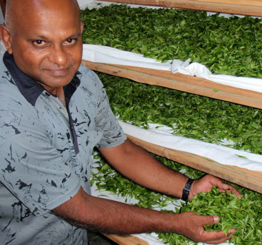 “We use old fashioned ‘tats’ and the wither takes around 20-22 hours.” Karuna, manager, as he turns the tealeaves