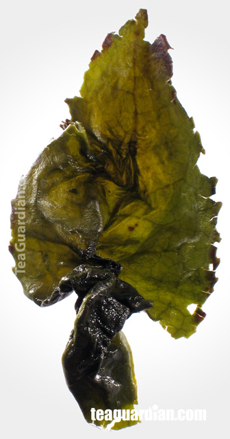 The infused leaves of a properly made Tieguanyin (enlarged) Notice that the edges of the leaf is broken. The reddened edges of the leaves of the Tieguanyin cultivars taste very bitter and are taken by a unique step in the production process: beating. The resultant leaves have this typical broken edge look, but most are usually stalk in, i.e. linked with one or two other leaves sharing the same stalk. This one is taken out to enlarge to show the difference.
