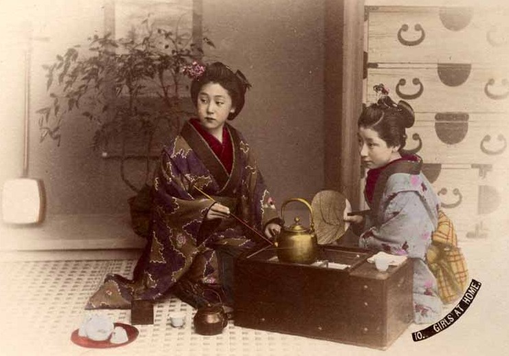 Girls making tea at home. The teapot and steamed green tea, such as Gyokuro, has been part of the daily life in Japan since antiquity