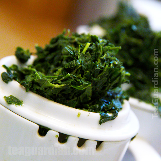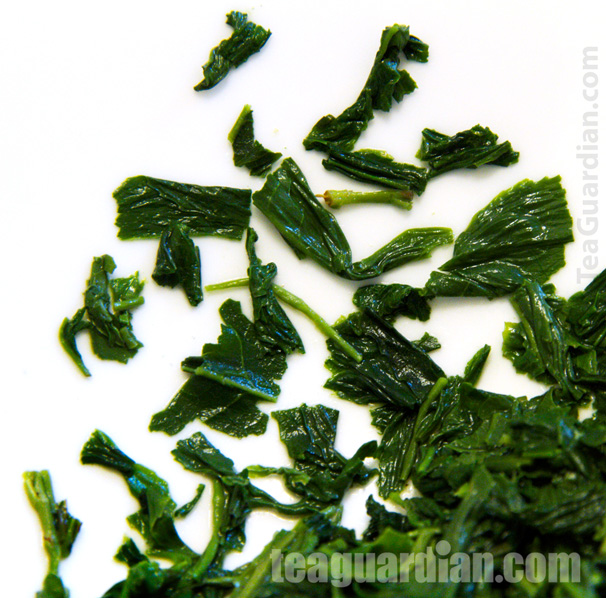 Notice the thinness of the leaves now that they have un-rolled. The creases and brokenness tell of the amount of processing done onto them. The softness and small size of these leaf fragments are good in allowing a short infusion time, but the same advantage also mean the tea can easily be too bitter and too strong upon not-so-well-controlled time-temperature combination. They also cling quite stubbornly to the teapot.
