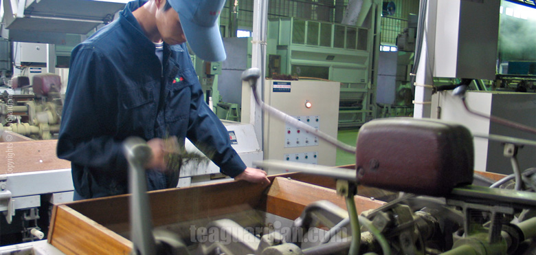 Green tea production: workman checking evenness of twist-forming of the steamed tealeaves in a production line in a tea factory in Zhejiang. In green tea production, there are large factories, medium factories such as this one, traditional family hand-work factories of various sizes and those that operate in a small house.