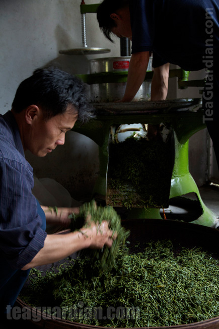 Loosening of the twisted tea for the next stage. The green structure in the background is the base to a most popular twisting machine used locally, and is the most automatic part of the process. The twisted leaves fall through the rectangular spout (in the shadow near the middle of the photo) onto the basket below.
