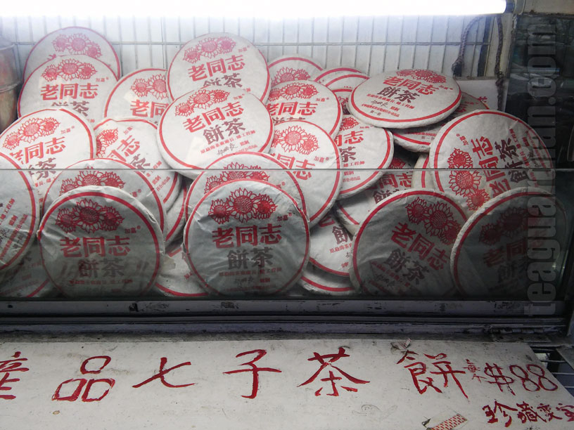 The sign reads: “…Product Qizi Cha Bing, each $88 ( HKD; 88 HKD is about 11 USD or 73 CNY )… store it well to turn it into treasure.” This store keeper scattered the products in an open plexiglass tray facing a busy street adjacent to some garages.