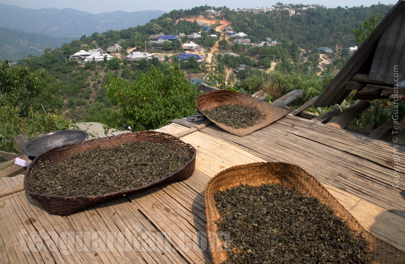 Tea being sun-dried to make maocha on the roof top in a tea farm worker’s home in Yunnan. This is obviously for home use. Notice how the tea has already become darker colour upon long exposure to the sun.